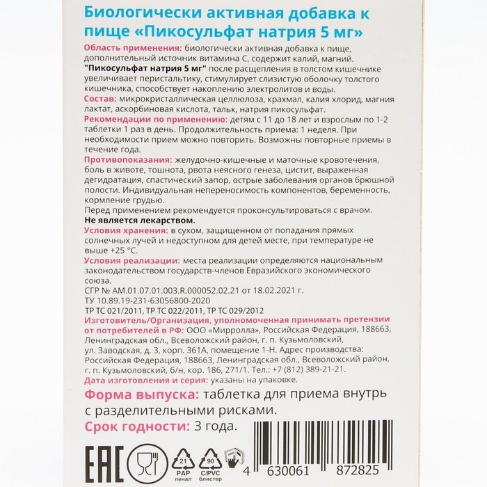 Состав: микрокристаллическая целлюлоза, крахмал, калия хлорид, магния лактат, аскорбиновая кислота, тальк, натрия пикосульфат 5 мг.