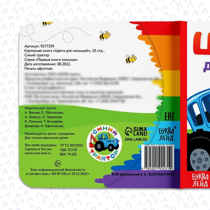 Картонная книга «Первая книга. Цвета для малышей», 10 стр., 15 × 15 см, Синий трактор