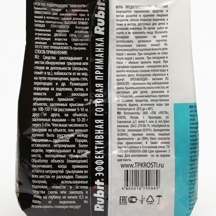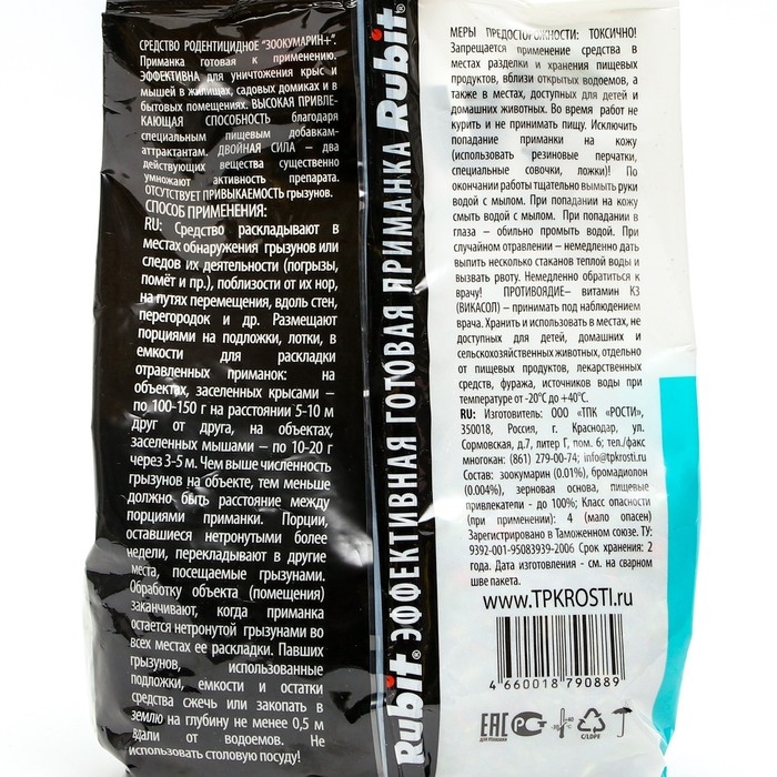 - Приманка не вызывает отпугивающего действия и настороженности других особей, т.к. гибель грызунов происходит через 3-6 суток после поедания брикетов.