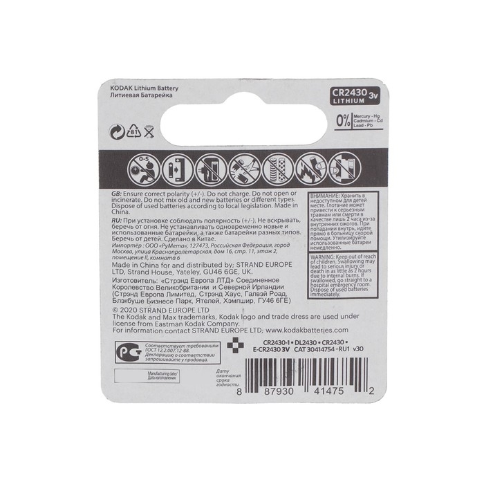 Батарейка литиевая Kodak Max, CR2430-1BL, 3В, блистер, 1 шт.