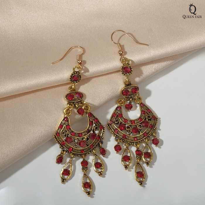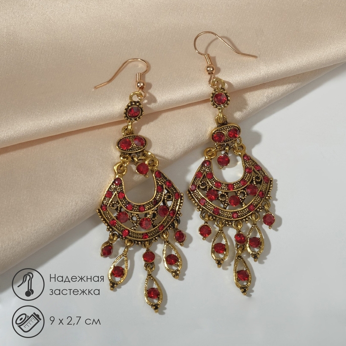 Серьги висячие со стразами «Восток» веер, цвет красный в чернёном золоте, 9см