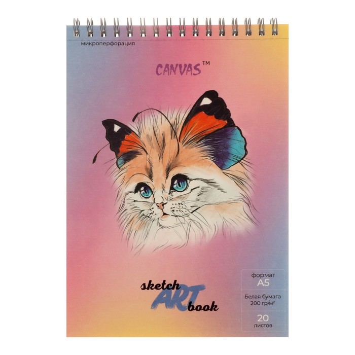 Скетчбук для акварели А5, 20 листов на гребне "Кошка-бабочка", обложка мелованный картон, матовая ламинация, выборочный УФ-лак, блок 200 г/м2