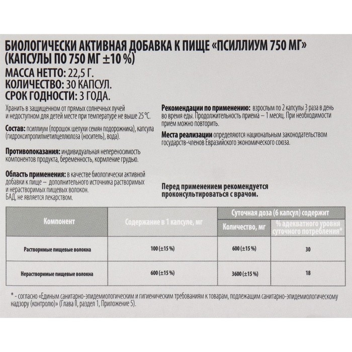 Применение: в качестве источника пищевых волокон взрослым по 5 капсул в день, запивая не менее 250 мл воды. Можно разделить на несколько приемов. Продолжительность приема – 30 дней. При необходимости курс можно повторить.