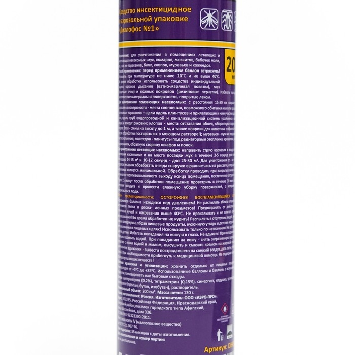 Меры предосторожности: огнеопасно! Не распылять вблизи открытого огня. Предохранять от воздействия прямых солнечных лучей. Не допускать нагревания свыше 40С. Не курить во время использования. Не давать детям. Распылять в отсутствие людей, домашних животных, птиц. Закрыть аквариумы, убрать пищевые продукты, кухонные предметы. Избегать попадания на синтетические материалы, поверхности покрытые лаком. Беречь от попадания средства в глаза, промыть большим количеством воды. После работы тщательно вымыть руки с мылом.