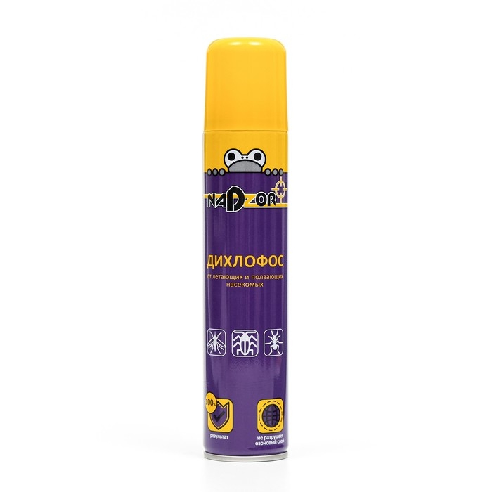Дихлофос за считанные минуты избавляет от насекомых в помещении. Высокоэффективная многокомпонентная формула аэрозоля гарантирует защиту от широкого спектра насекомых. Дихлофос - одно из самых популярных средств, используемое для уничтожения домашних, ползающих и летающих насекомых-паразитов, применяемое для обработки помещений. Применяется для уничтожения летающих насекомых (мухи, комары, осы, москиты, бабочки моли) и нелетающих насекомых (тараканы, клопы, блохи, муравьи, кожееды) в помещениях. 100% результат. Действия дихлофоса, сначала парализуется передвижение насекомых, после чего насекомые погибают от токсического действия препарата.