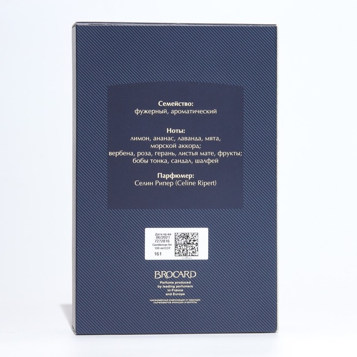 Парфюмер Патрис Мартен создал мужские духи с насыщенным пряным ароматом, мимо которого просто невозможно пройти равнодушно - это BROCARD Gentleman. Парфюм выпустила известная компания Брокар - российская парфюмерия.- Бодрящая свежесть лимона, лайма и лаванды, дополненная соленым морским аккордом и мятой создает ощущение безупречной чистоты. Туалетная вода которая привлекает своим магнетизмом.