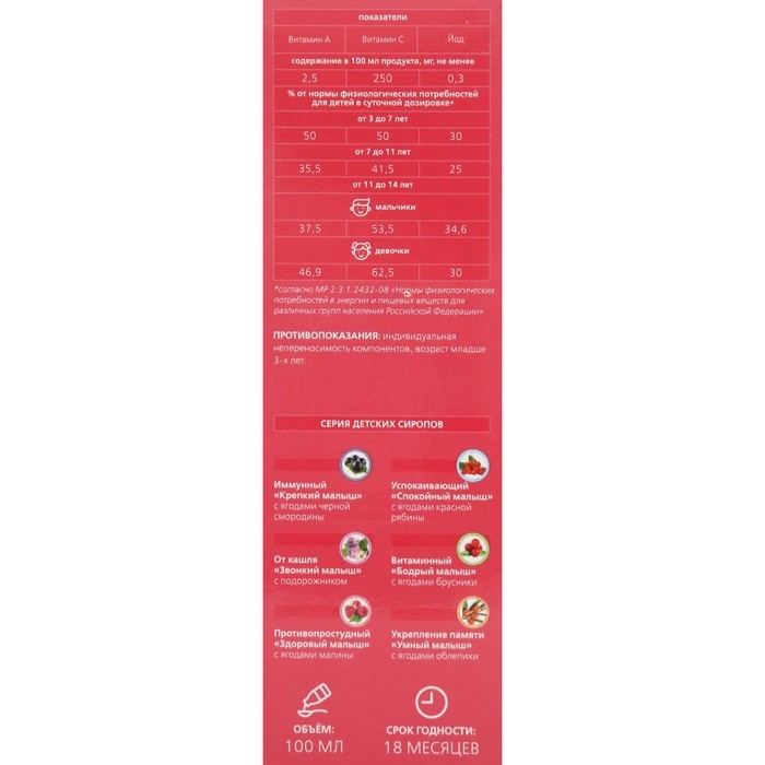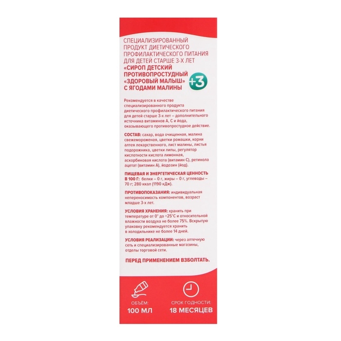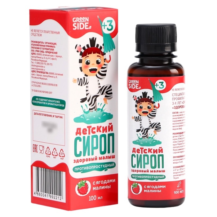 Ваш малыш кашляет и чихает? Облегчить состояние ребёнка при простудных заболеваниях поможет натуральный растительный сироп «Здоровый малыш». Он создан на основе ягод малины и комплекса лекарственных трав - липы, алтея, ромашки, подорожника и др. Сироп оказывают противовоспалительное, антитоксическое, спазмолитическое, жаропонижающее, отхаркивающее действие. Приём сиропа поможет легче перенести простудное заболевание - снижает выраженность симптомов, уменьшает риск развития осложнений. Подходит для комплексной терапии ОРВИ и ОРЗ.