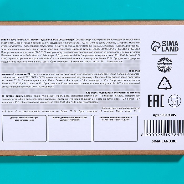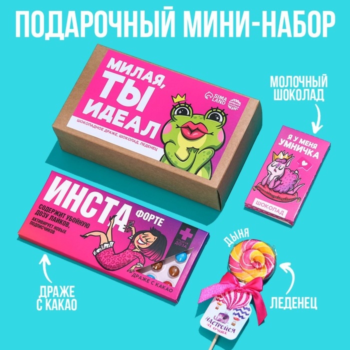Мининабор «Милая, ты - идеал»: шоколадное драже 20 г., молочный шоколад 27 г., леденец на палочке со вкусом дыни 15 г.