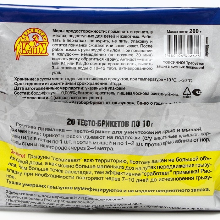 Применение: брикеты раскладывают на подложки (б/у жестяные крышки, картонки) или в лотки по 1 шт. против мышей и по 1–2 шт. против крыс вблизи от нор, вдоль стен и перегородок через 2–4 метра.
