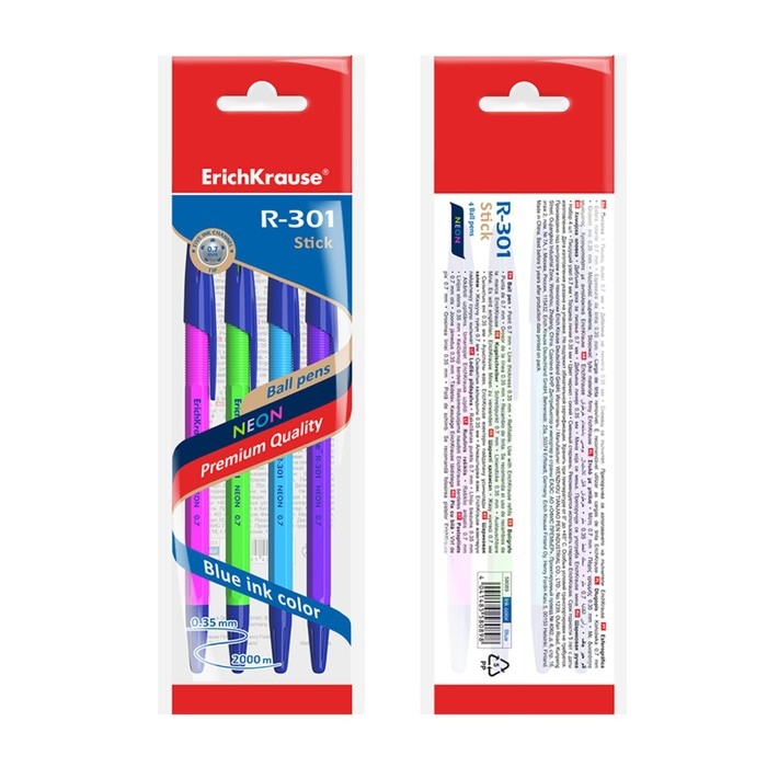 Набор ручек шариковых 4 штуки, ErichKrause R-301 Neon Stick, узел 0.7 мм, чернила синие, корпус неоновый, длина линии письма 2000 метров, МИКС