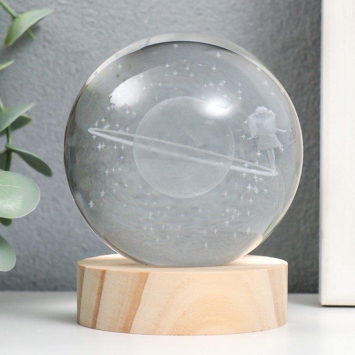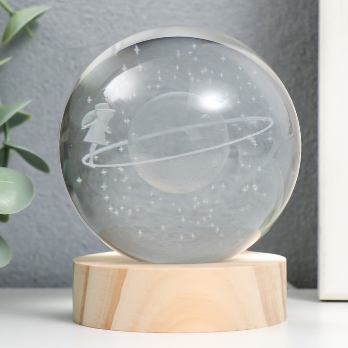 Сувенир стекло подсветка "Девочка в космосе" d=8 см подставка дерево, USB 8х8х9,5 см