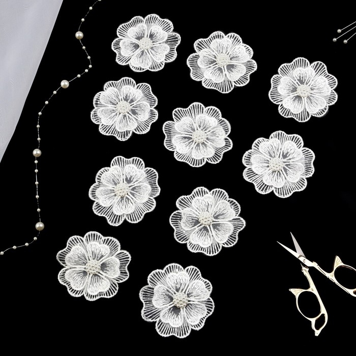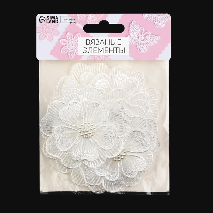 Вязаные элементы «Двойные цветочки», d = 6 см, 10 шт, цвет белый