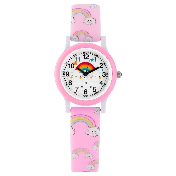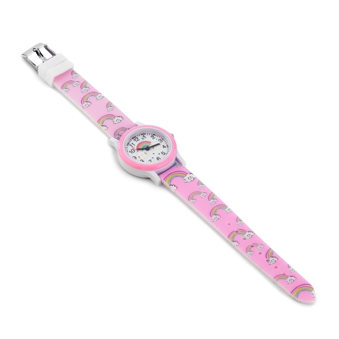 Яркие детские наручные часы - модный аксессуар для девочек с важным функциональным предназначением. Благодаря наличию такого типа часов ребенок научится распознавать время и планировать свои дела. Часы с рисунком облаков с радугой однозначно заинтересуют любую девочку.