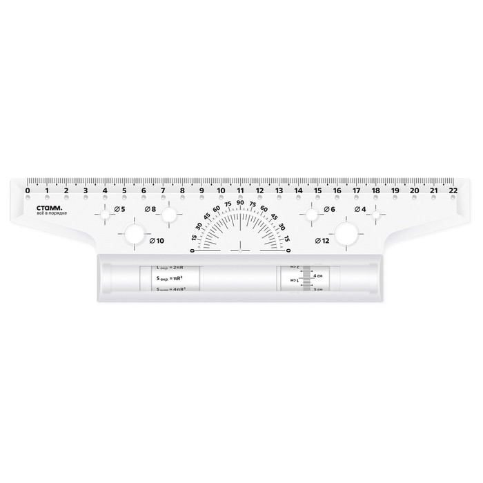 Рейсшина 22 см, предназначена для выполнения чертёжных и измерительных работ. Линейка-рейсшина оборудована металлическим роликом, и идеально подходит для нанесения ровных параллельных линий. Длина шкалы – 22 см. Благодаря специальному покрытию ролика линейка не проскальзывает по бумаге. На изделии предусмотрен транспортир 180° и 6 трафаретов окружностей. Изготовлена из качественного полистирола. Рейсшина упакована в картонную коробку с европодвесом. Цвет изделия - прозрачный бесцветный.