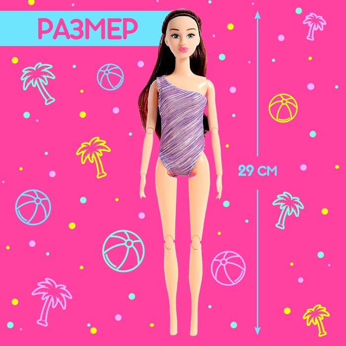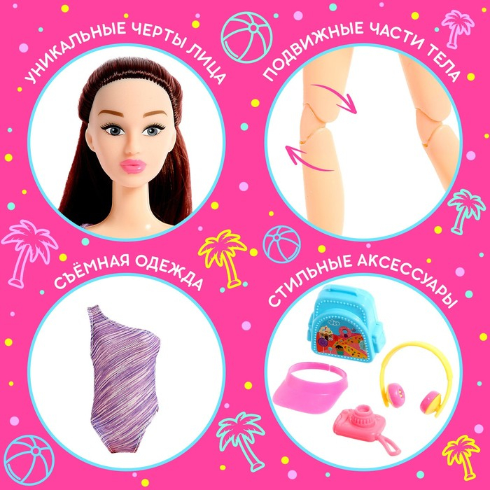 Кукла шарнирная, у неё сгибаются руки и ноги. В комплекте идут фотоаппарат, рюкзак, кепка и наушники для настоящей модницы. Отправляйтесь вместе с ней на пляж и запечатлейте яркие моменты! Используйте тубус для хранения мелких детских вещей.