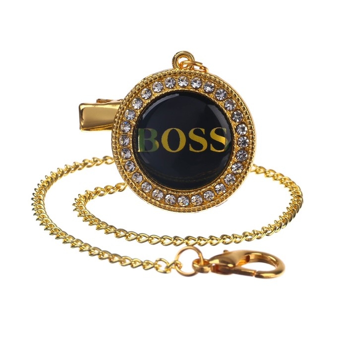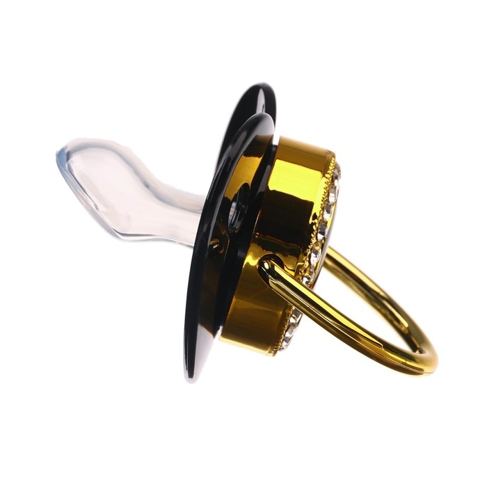 Соска - пустышка силиконовая ортодонтическая «BOSS», от 6 мес., с колпачком + держатель - цепочка, цвет черный/золото, стразы