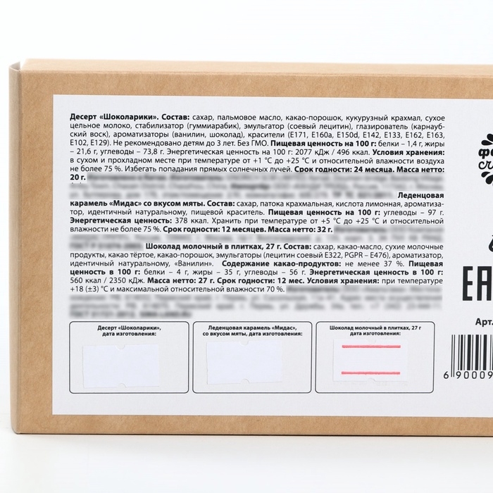 Состав: сахар, масло растительное гидрогенизированное (масло пальмовое), какао-порошок (2,3 %) (содержание какао-масла - 4,0 %), молоко сухое цельное, сыворотка молочная сухая, загуститель - гуммиарабик, эмульгатор - лецитин соевый, ароматизаторы: "Ванилин", "Фундук", "Шоколад"; отбеливатели: воск пчелиный, воск карнаубский; красители пищевые: "Диоксид титана", Е160а, Е150d, Е142, Е133, Е162, Е129, Е102.