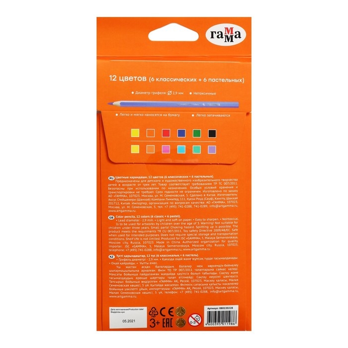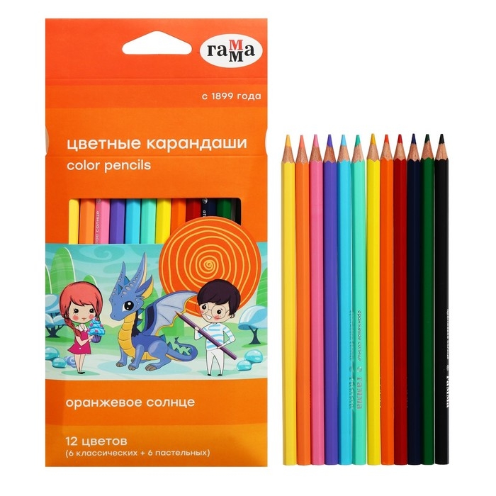 Карандаши цветные 12 цветов (6 классич. + 6 пастельных), Гамма "Оранжевое солнце", заточенные, картонная упаковка, европодвес 80220228