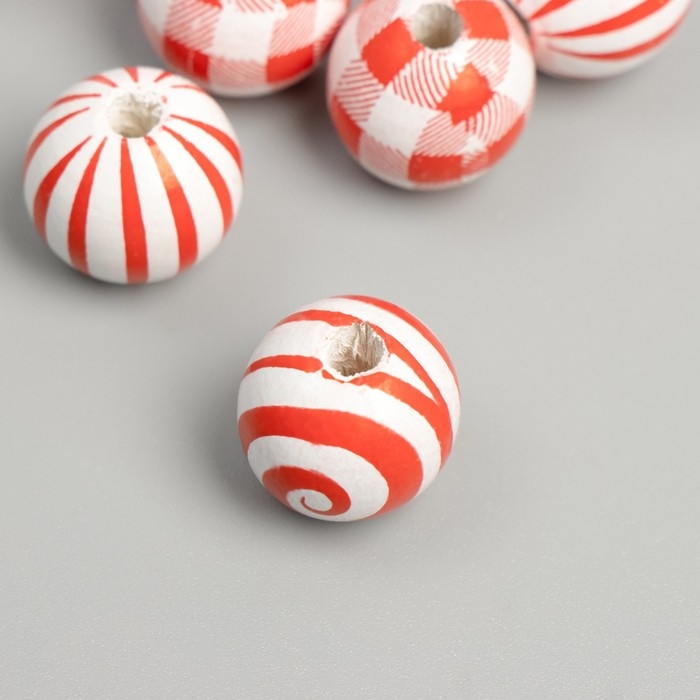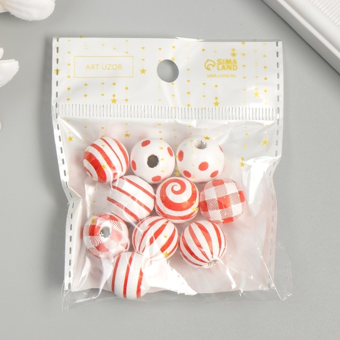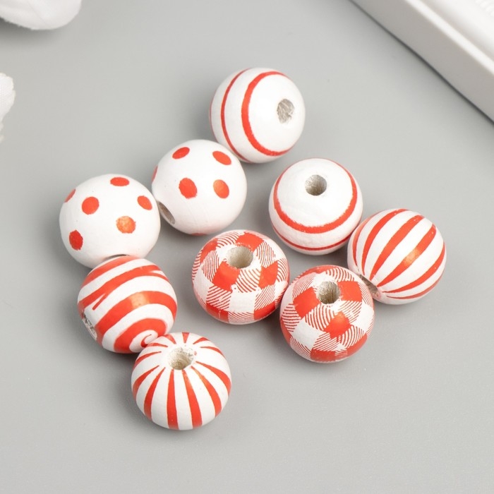 Бусины дерево для творчества "Круглые. Красные узоры на белом" d=1,6 см набор 10 шт