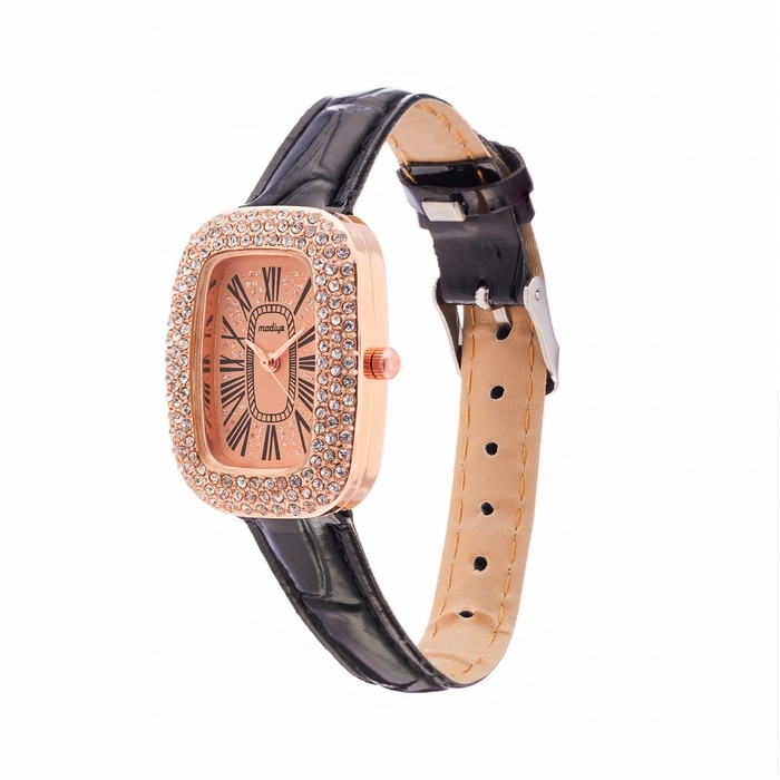 - Чёрный ремешок гармонирует с любыми цветами одежды, придавая образу завершенность и уверенность.