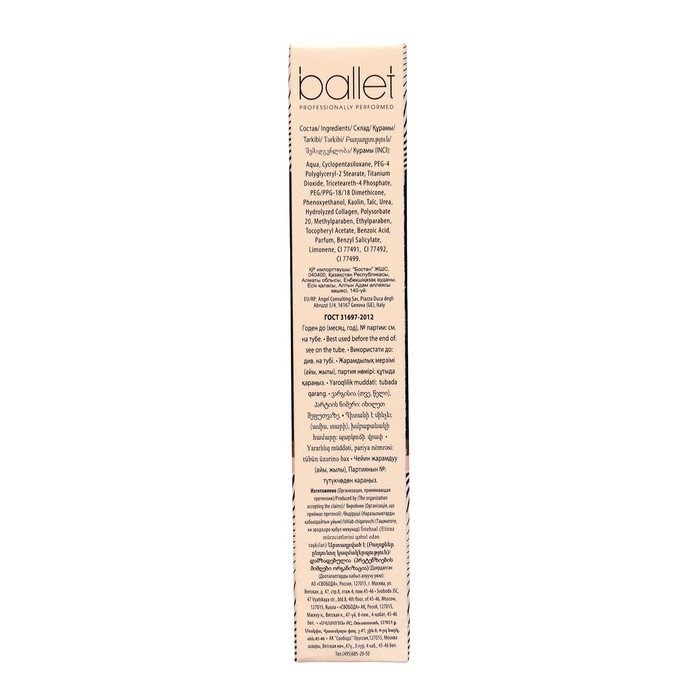 вода, циклопентасилоксан, ПЭГ-4 полиглицерил-2 стеарат, диоксид титана, трицетеарет-4 фосфат, ПЭГ/ППГ-18/18 диметикон, феноксиэтанол, каолин, тальк, карбамид, гидролизованный коллаген, полисорбат 20, метилпарабен, этилпарабен, токоферола ацетат (витамин Е), бензойная кислота, парфюмерная композиция (бензилсалицилат, лимонен), CI 77491, CI 77492, CI 77499 (пигменты – красный, желтый, черный).