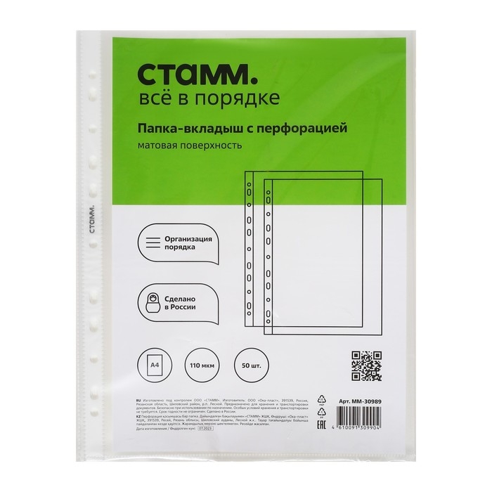 Файл-вкладыш А4, 110 мкм, СТАММ, матовый, вертикальный, 50 штук