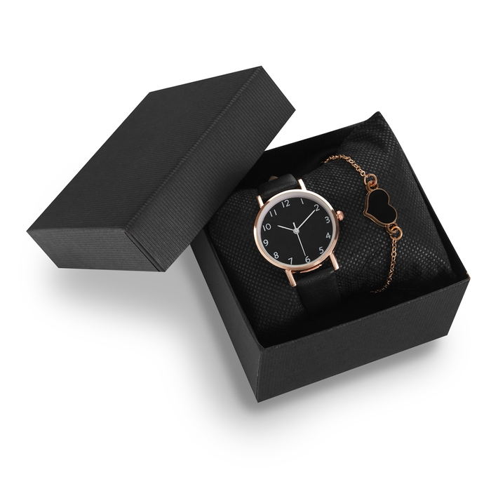 Классный набор для современной девушки, которая хочет всегда и во всем быть в тренде и на волне. Часы "Сердце" оснащены браслетом в черном цвете из прочного материала. Набор дополнен браслетом золотистого цвета и амулетом в виде черного сердца.