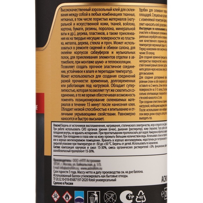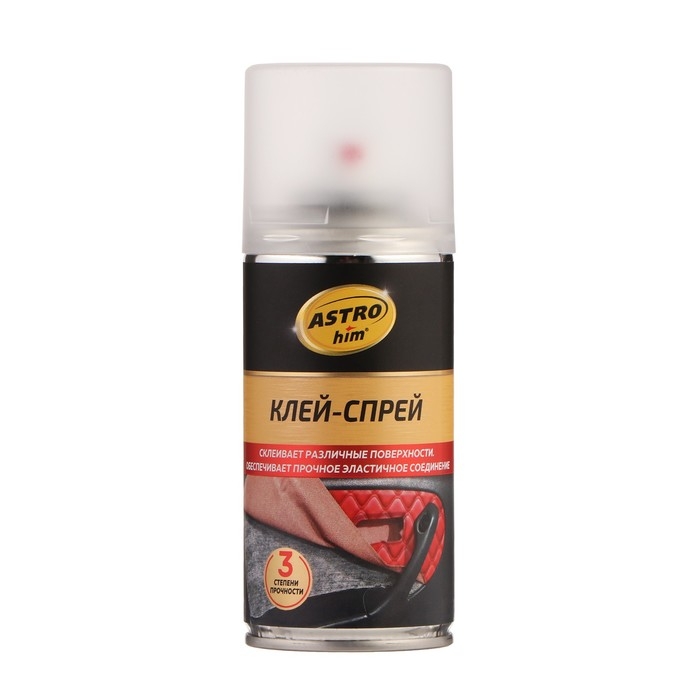 ASTROhim Клей-спрей - высококачественный аэрозольный клей для склеивания между собой в любых комбинациях тканных, нетканых, в том числе пористых материалов (натуральной и искусственной кожи, тканей, войлока, картона, бумаги, резины, поролона, минеральной ваты и др.), дерева, пластиков, а также приклеивания их на твердые несущие поверхности из пластика, металла, дерева, стекла и проч. Может использоваться в ремонте сидений и обивки салона, для оклейки корпусов сабвуферов и музыкальных полок, для приклеивания элементов отделки в автомобиле, при монтаже шумо- и теплоизоляции.
