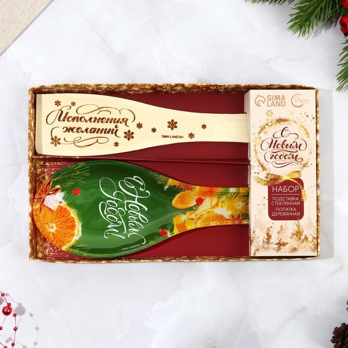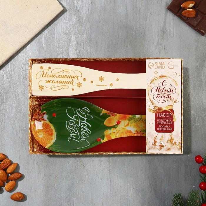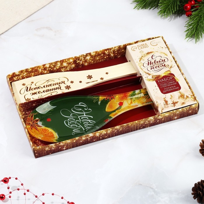 Новогодний подарочный набор состоит из стеклянной подставки под ложку размером 21,4 x 7,5 x 2 см и деревянной лопатки.