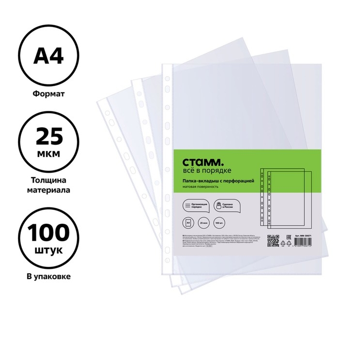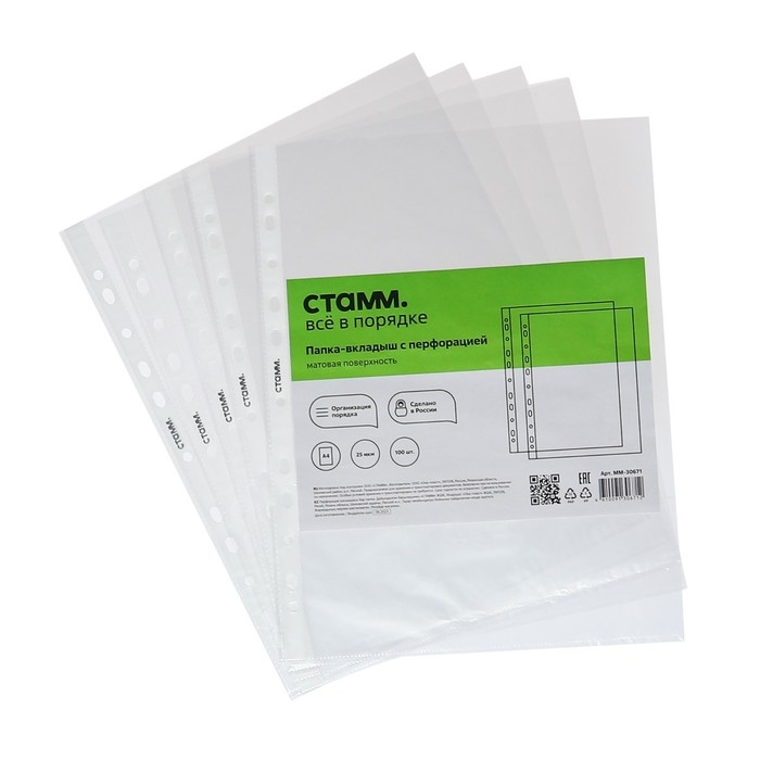 Файл-вкладыш А4, 25мкм, СТАММ, матовый, вертикальный, 100 штук