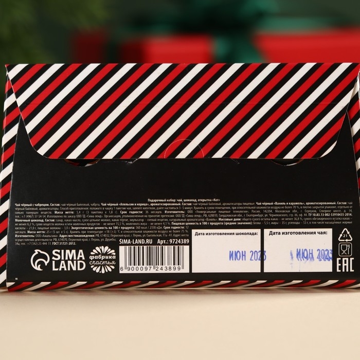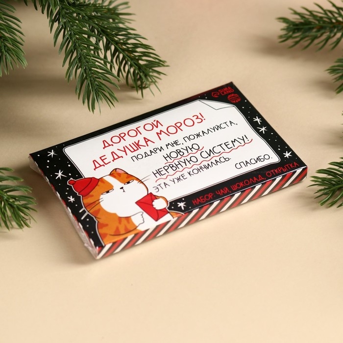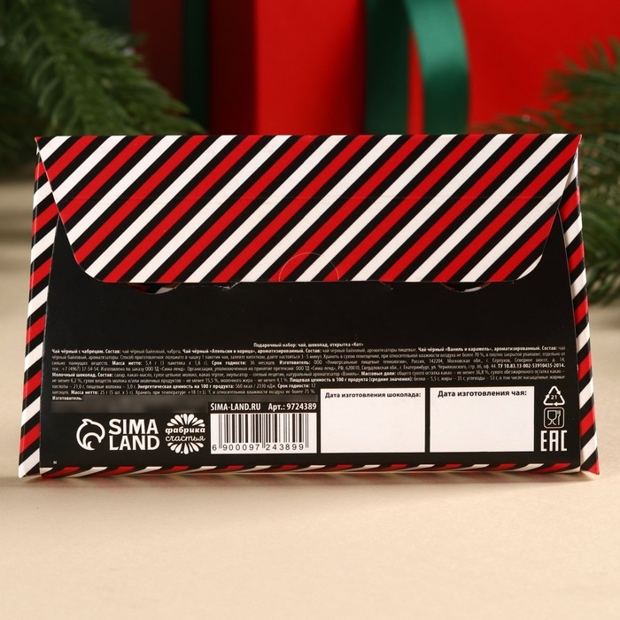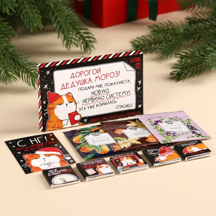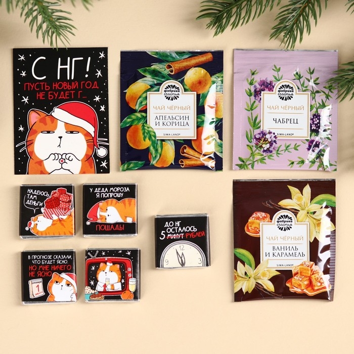Подарочный набор «Кот»: чай ассорти 5,4 г ( 3 шт. х 1,8 г)., молочный шоколад 25 г (5 шт. х 5 г)., открытка