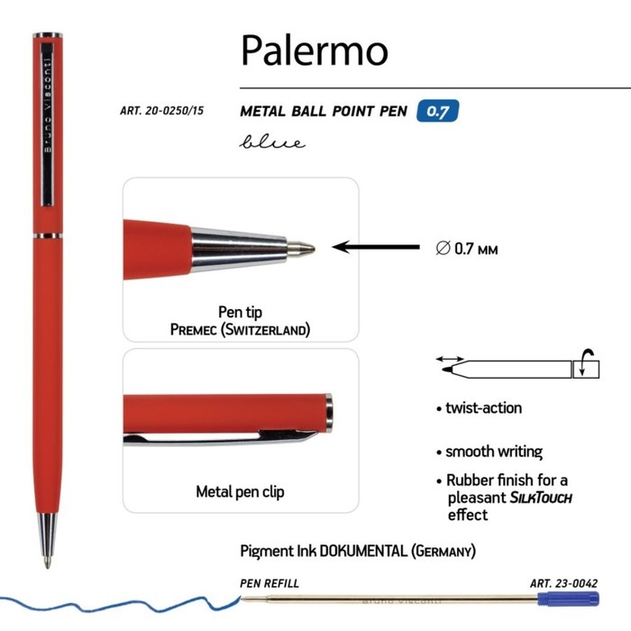 Покрытие корпуса Soft Touch гарантирует дополнительный комфорт в работе с ней. Стержень легко выдвигается благодаря поворотному механизму. Синие пигментные чернила DOKUMENTAL (Германия) и пишущий узел Premec (Швейцария) – обеспечивают качественное и мягкое письмо.