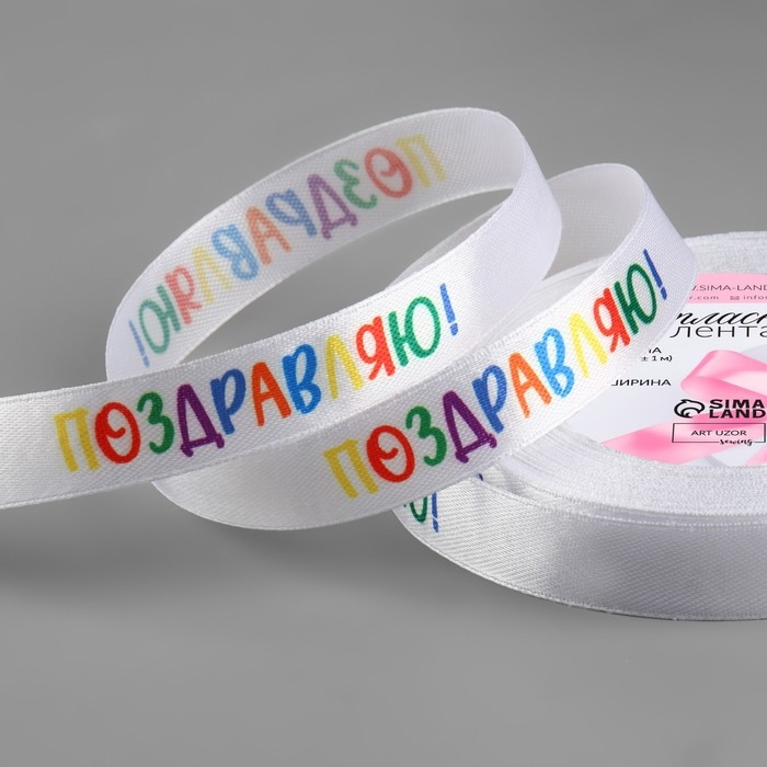 Лента атласная «Поздравляю!», 15 мм × 23 ± 1 м, цвет белый