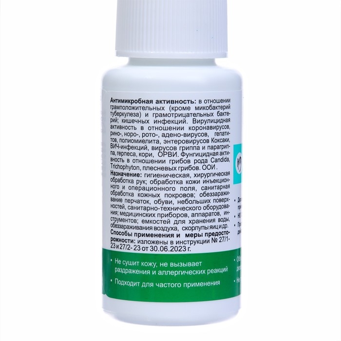 Средство обладает антибактериальной активностью в отношении грамположительных (включая микобактерии туберкулёза) и грамотрицательных бактерий, вирулицидной активностью (включая вирусы энтеральных и парентеральных гепатитов, полиомиелита, ВИЧ, вирусов "атипичной пневмонии" (SARS), герпеса, вирусов гриппа, в том числе гриппа H1N1, гриппа H5N1 и др.) и фунгицидной активностью в отношении грибов рода Кандида и дерматофитов.