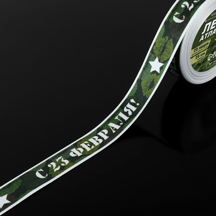 Лента атласная «С 23 Февраля!», 25 мм × 23 ± 1 м, цвет зелёный