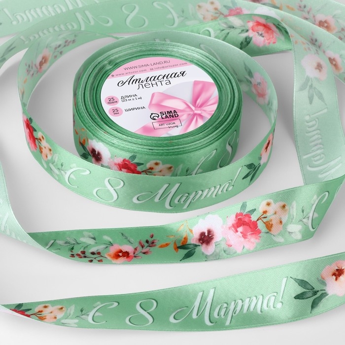 Лента атласная «С 8 Марта!», 25 мм × 23 ± 1 м, цвет зелёный