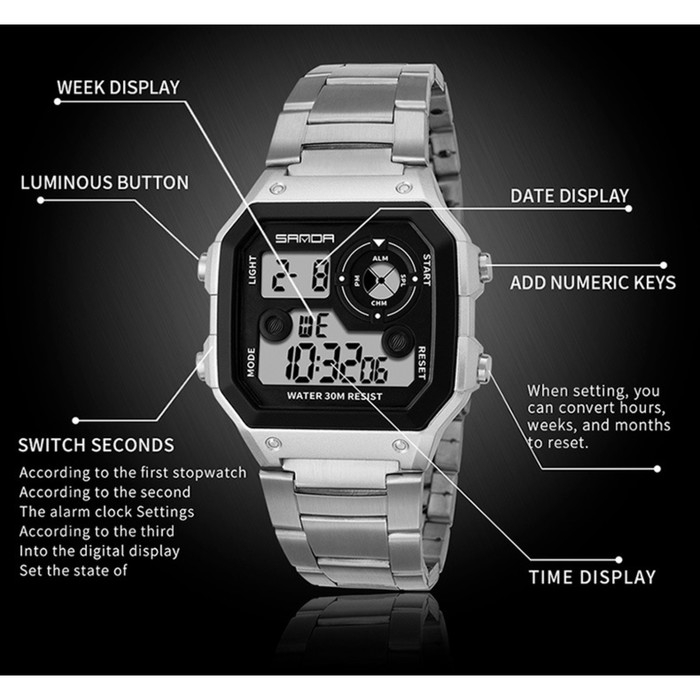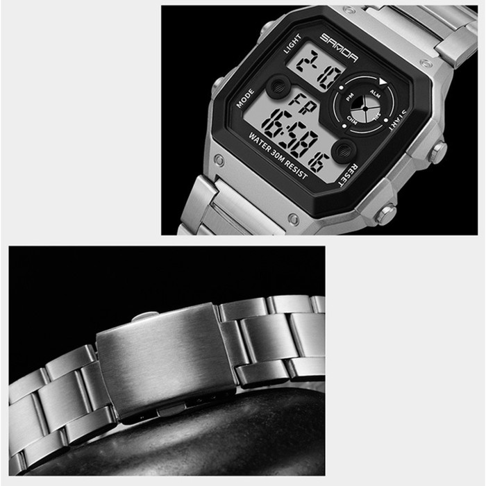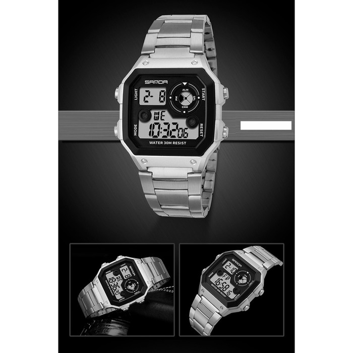 Часы наручные электронные мужские, d-4.4 см, будильник, календарь, ремешок металл, серебро