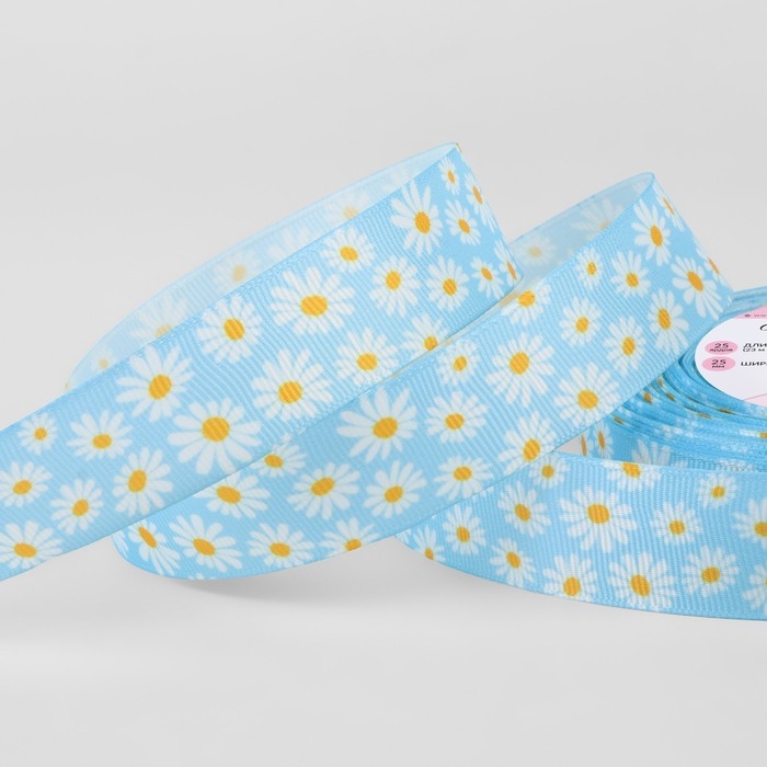 Лента репсовая «Весёлые ромашки», 25 мм, 23 ± 1 м, цвет голубой