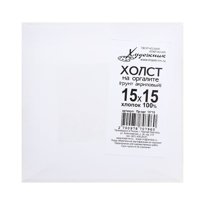 Холст на оргалите, 15 х 15 см, хлопок 100%, акриловый грунт, мелкое зерно, 210 г/м2