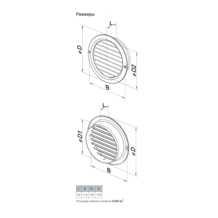 Круглая вентиляционная решетка устанавливается на наружную стену на вентиляционное отверстие и подсоединяется к воздуховоду диаметром 100 мм. Для соединения с воздуховодом используется фланец.