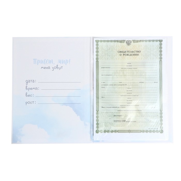 Папка под свидетельство о рождении формата А4 имеет удобный файл внутри, который защитит первый в жизни документ малыша от повреждений.