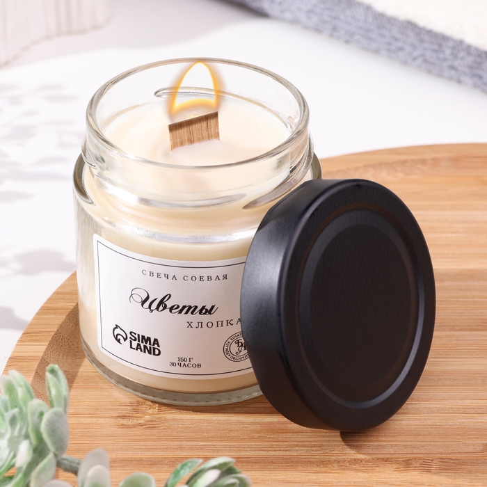 Свеча ароматическая из соевого воска в банке, 150 г, деревянный фитиль, цветы хлопка