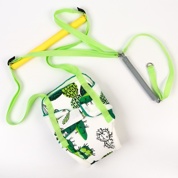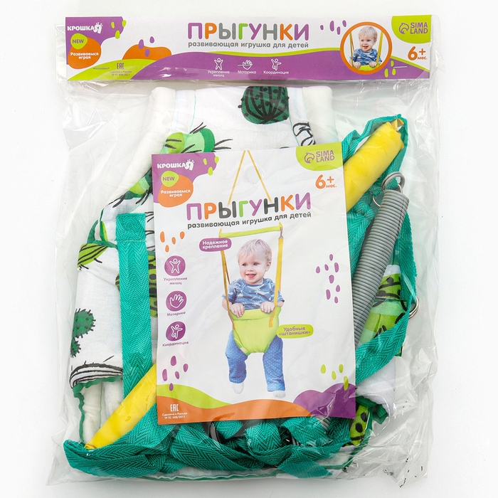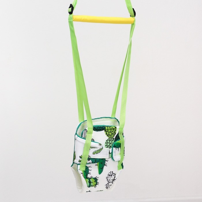 Посадите полугодовалого кроху в сиденье-штанишки. Малышу понравится активная игра, он будет подпрыгивать и качаться. Размер посадочного места можно настроить индивидуально, а за перекладину ребёнку будет удобно держаться.