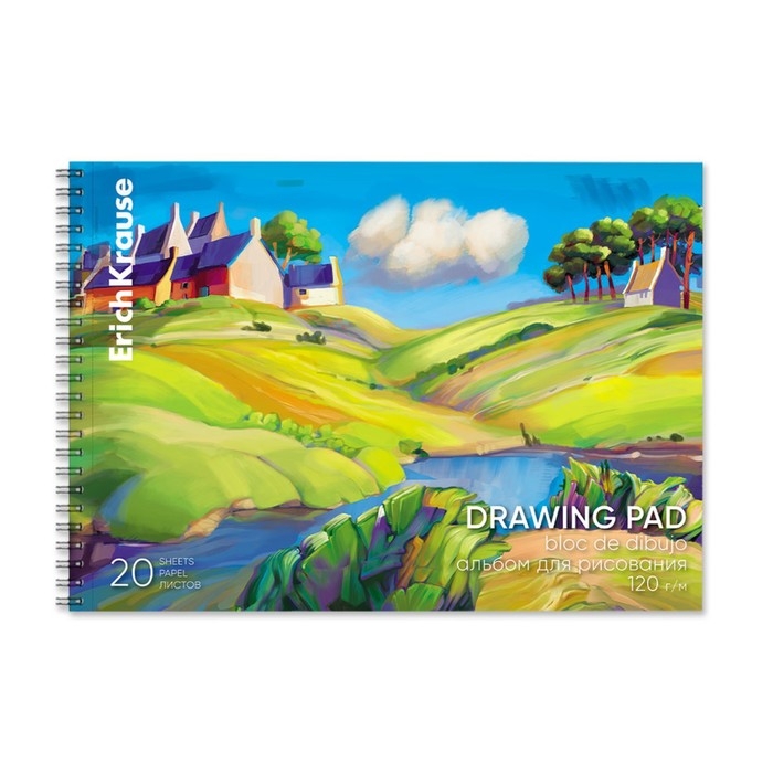 Альбом для рисования формата А4 (210х294 мм). Обложка из высококачественного мелованного картона плотностью 170 г/м2. Жесткая подложка 360 г/м2. В блоке 20 листов. Бумага плотностью 120 г/м2. Белизна бумаги - 100%. Микроперфорация для отрыва. Тип скрепления - спираль.