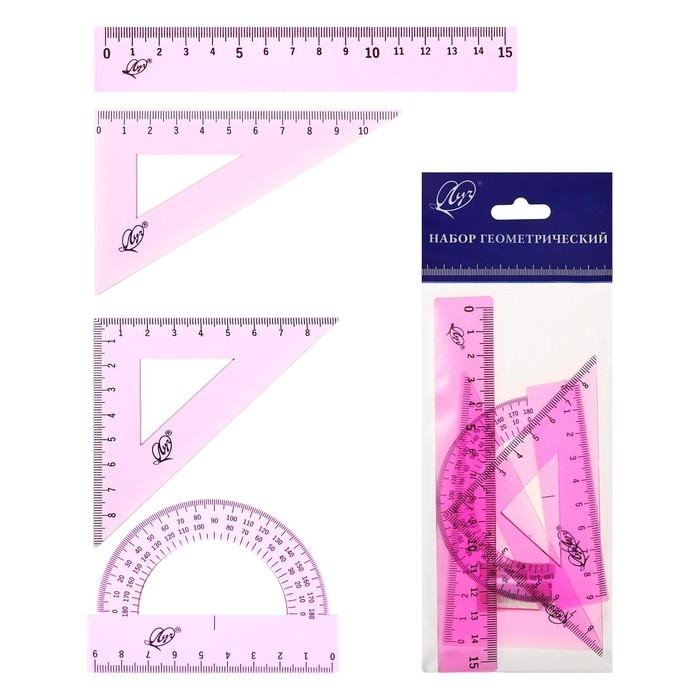 Предметы из набора (Линейка, два угольника, транспортир), предназначены чтобы:В наборе: Линейка 15 см, угольник 30 °/ 60 °, 10 см; угольник 45 °/ 45 °, 8 см; транспортир 180 °, 9 см.