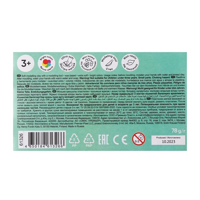 Мягкий восковой пластилин ErichKrause имеет мягкую консистенцию и особую пластичность, что делает его отличным инструментом для развития мелкой моторики у малышей и дошкольников. Пластилин не требует предварительного разминания, не застывает на воздухе, а также не прилипает к рукам и не пачкает одежду. Цветовая палитра содержит яркие насыщенные цвета, которые отлично смешиваются между собой, создавая новые оттенки. Каждый брусок имеет индивидуальную упаковку «flow-pack», которая надежно сохраняет товарный вид и пластичные свойства продукта.