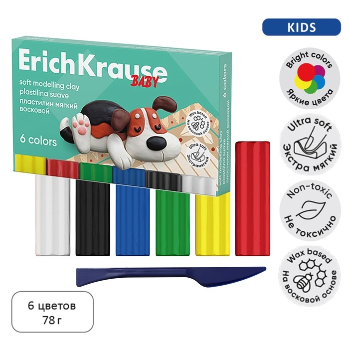 Пластилин мягкий (восковой) 6 цветов, 78 г, ErichKrause "Baby", со стеком, на растительно основе, с Алоэ Вера , европодвес