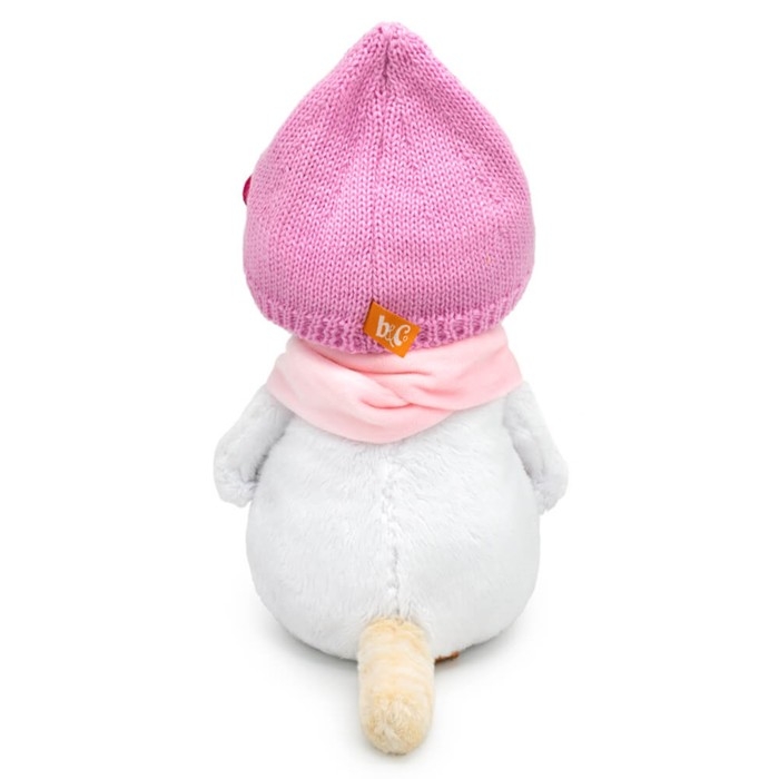 - На кошечке розовая вязаная шапочка и длинный шарфик из мягкого софта цвета розового жемчуга. Шапочку сбоку украшает блестящий бантик из ткани с пайетками цвета фуксии.