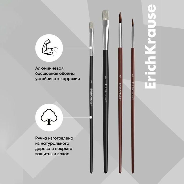 Кисти ErichKrause для рисования акварельными красками и гуашью. Рабочая часть кисти покрыта гуммирующим составом, защищающим ее при хранении и транспортировке. Ручка изготовлена из натурального дерева и покрыта защитным лаком. Цельнометаллическая бесшовная обойма из алюминия устойчива к коррозии.