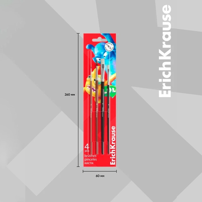 Набор кистей пони и щетина 4 штуки, ErichKrause "JollyFriends" для акварели и гуаши, в блистере
